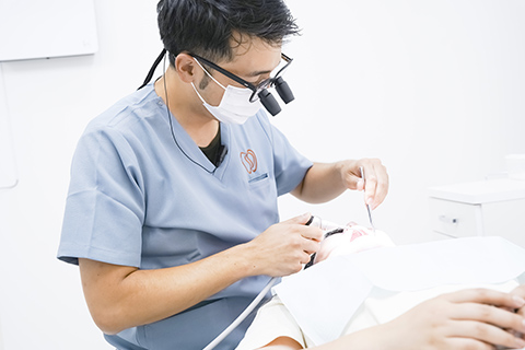 肉眼で見えない複雑な歯の根の細部まで、拡大鏡を使用しながら治療を行います。